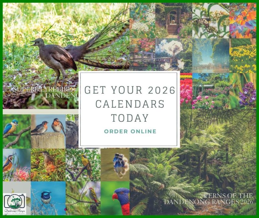 I’m thrilled to announce that the 2026 Calendars are now available. As usual, there are two, one for scenes from the Dandenong Ranges, the other Birds of the Dandenong Ranges. Full details can be seen via the Shop menu above or click here.